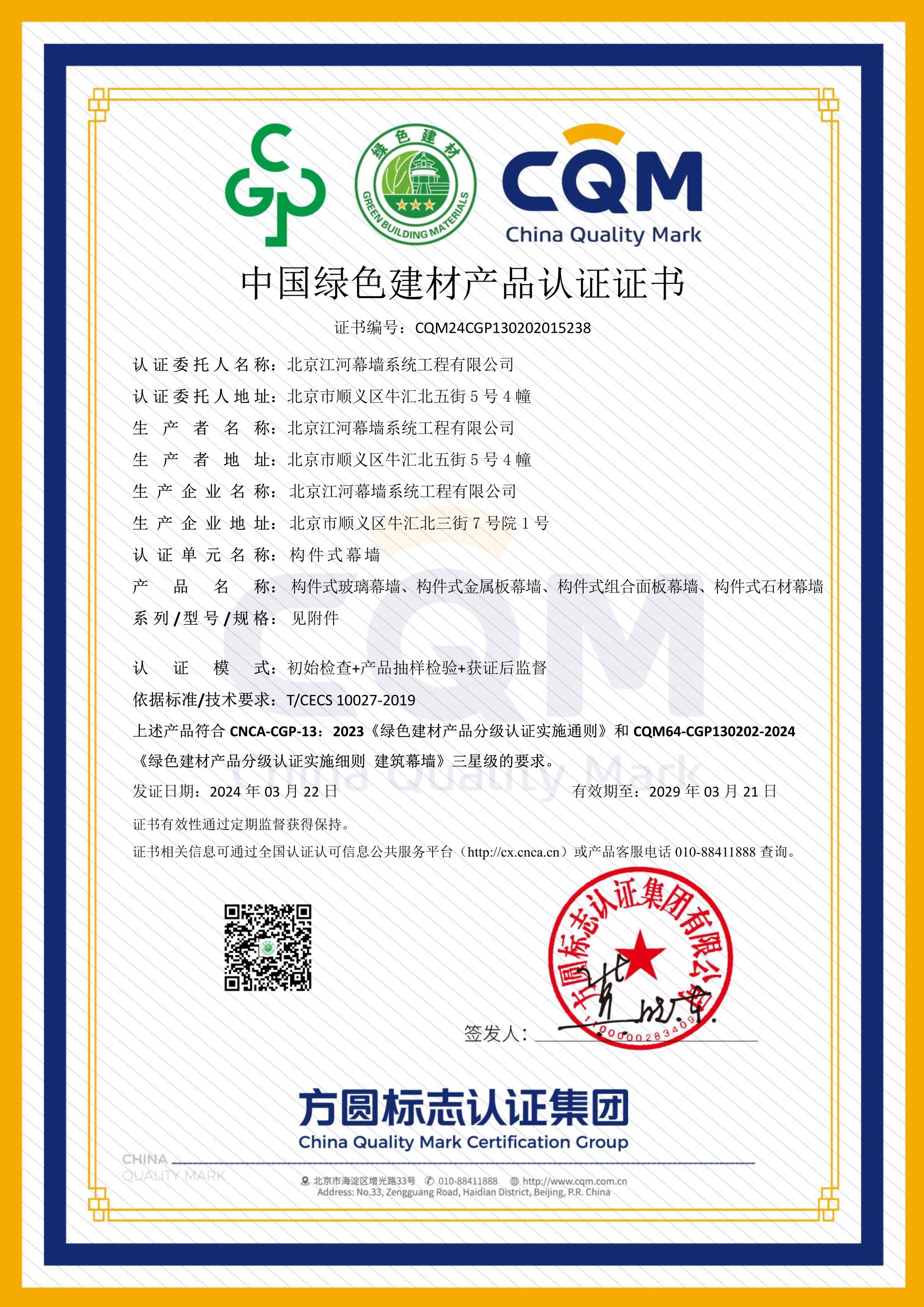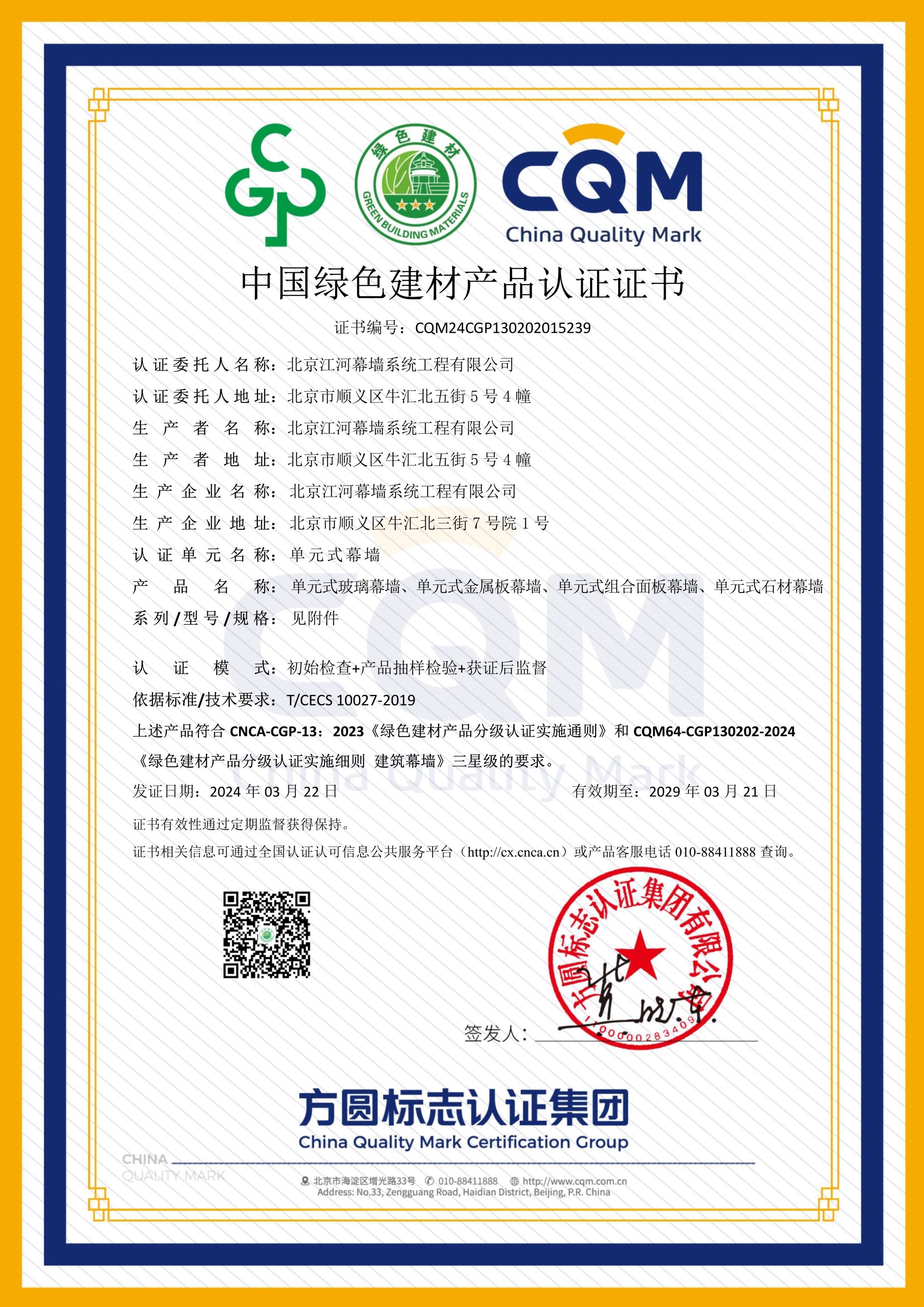绿色建筑之路再拓新篇 | 江河幕墙荣获����� �������Ƴ������������ �������Ƴ������������ �������Ƴ������������ �������Ƴ�������中国绿色建材产品三星级认证